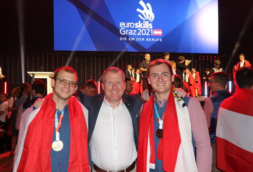Gmünd, am 27.09.2021. Sensationeller Erfolg für Leyrer + Graf: Georg Engelbrecht und Daniel Mühlbacher holten bei den diesjährigen EuroSkills die Goldmedaille in der Kategorie „Betonbau“ und damit den zweiten Europameistertitel für das Unternehmen in Folge.