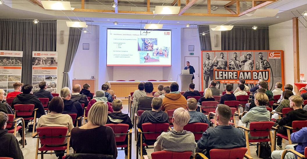 Die Besucher erhielten vom Firmenchef BM Dipl.-Ing. Stefan Graf höchstpersönlich einen Einblick in das Unternehmen und die vielfältigen Tätigkeitsbereiche. Im Anschluss stellte das HR-Team die einzelnen Lehrberufe sowie alles Wissenswerte rund um die Lehre am Bau vor und welche Benefits die zukünftigen Lehrlinge erwarten. In Interviews mit Mitarbeitern der Unternehmensgruppe Leyrer + Graf wurden nicht nur unterschiedliche Karrierewege beleuchtet, sondern auch ein tieferer Einblick in die Praxis gewährt, wie sich der Alltag am Bau gestaltet und wie die Lehrlinge an ihre neue Aufgabe herangeführt werden. Schließlich ist noch kein Meister vom Himmel gefallen und junge Fachkräfte brauchen neben Talent und Interesse auch eine fundierte und qualitative Ausbildung, um ihre volle Kraft zu entfalten.